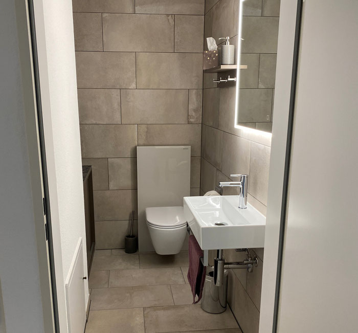 Im kleinen Badezimmer hat es eine Toilette und ein Lavabo mit Spiegel und genügend Stangen um die Badetücher zu trocknen.