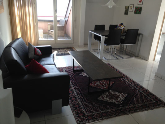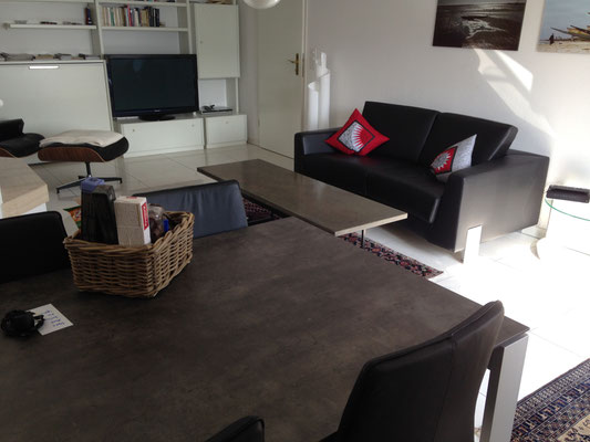 Das Wohnzimmer ist ca. 25 m2 groß. Es ist 2015 neu eingerichtet worden mit Sofa, Sessel, einer Essecke mit vier Sitzplätzen sowie einem Flachbild-Fernseher. In der Wohnwand ist ein komfortables, ausklappbares Bett integriert.