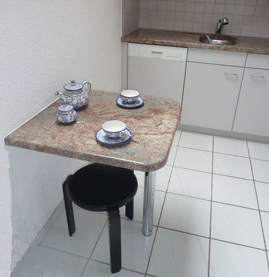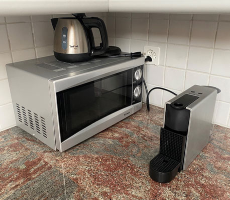La cuisine en angle mesure 12 m². Elle comprend un réfrigérateur avec compartiment congélateur, une cuisinière, un four, huit placards avec vaisselle, casseroles et épices, un lave-vaisselle et des plans de travail. Un micro-ondes, une bouilloire et une machine à café Nespresso sont également à votre disposition.